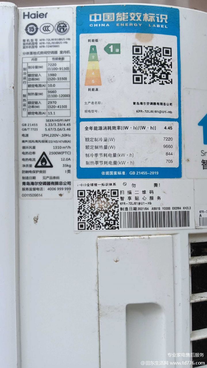 9.5成新,海尔大三匹变频一级能效空调