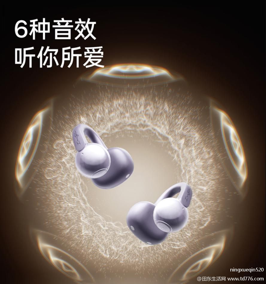 很多人对开放式耳机的音质不抱期待,但这款耳机给出了惊喜。12mm大口径PU+LCP复合振膜,搭配大黑铜包铝音圈,高频通透、低频澎湃。再加上BassTurbo低音增压引擎和双后腔调音孔,节奏感与清晰度兼备。内置6种音效可自由切换:动感模式适合运动,人声模式适合追剧播客,空间音效模拟三维立体声场,听歌沉浸感拉满。