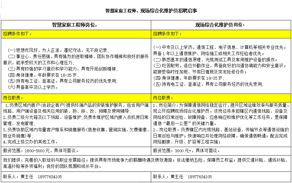 智慧家庭工程师、现场综合化维护员招聘启事