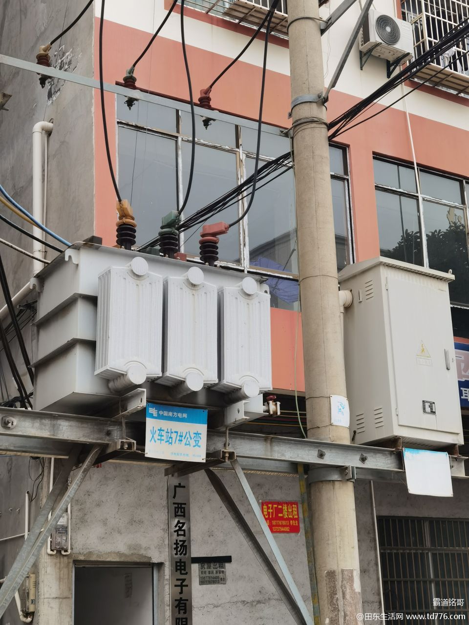 致:南方电网田东分公司,油城路小塘二巷(羽晨酒店对面),变压器电箱破损问题,十几年前这个问题就存在,本人电力相关知识不是很专业,但这个电箱明显破损,缺半边盖,部分线头明显外露,雨天常看到冒火花,附近还是蛮多住户,为了安全能否维修整改?如果需要的话,本人可以捐一个电箱,人民群众安全应放第一位,因为本人电力知识不是很专业,如观点阐述有误的话,请电力公司专业人士指正